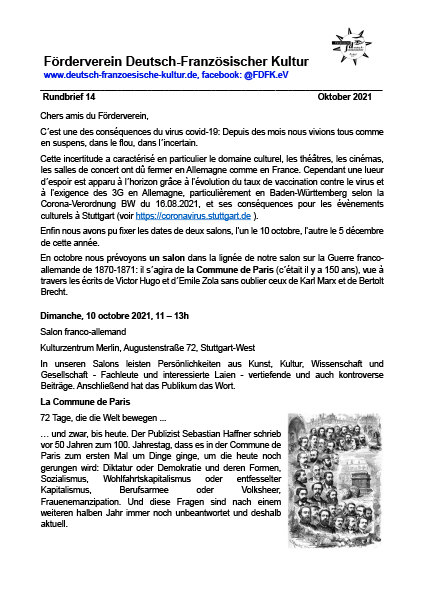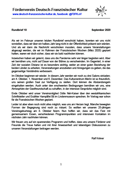 Dieser Rundbrief stellt die schwierige Situation des Vereins während der Coronapandemie dar.