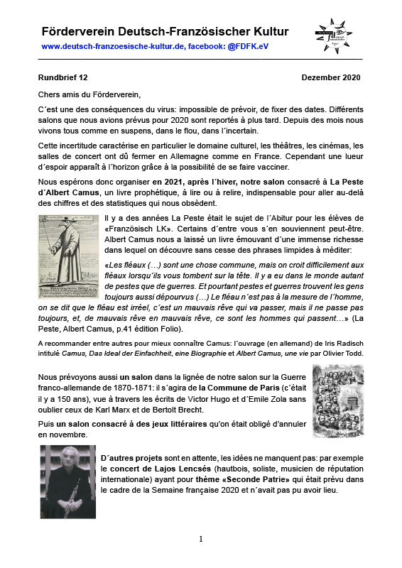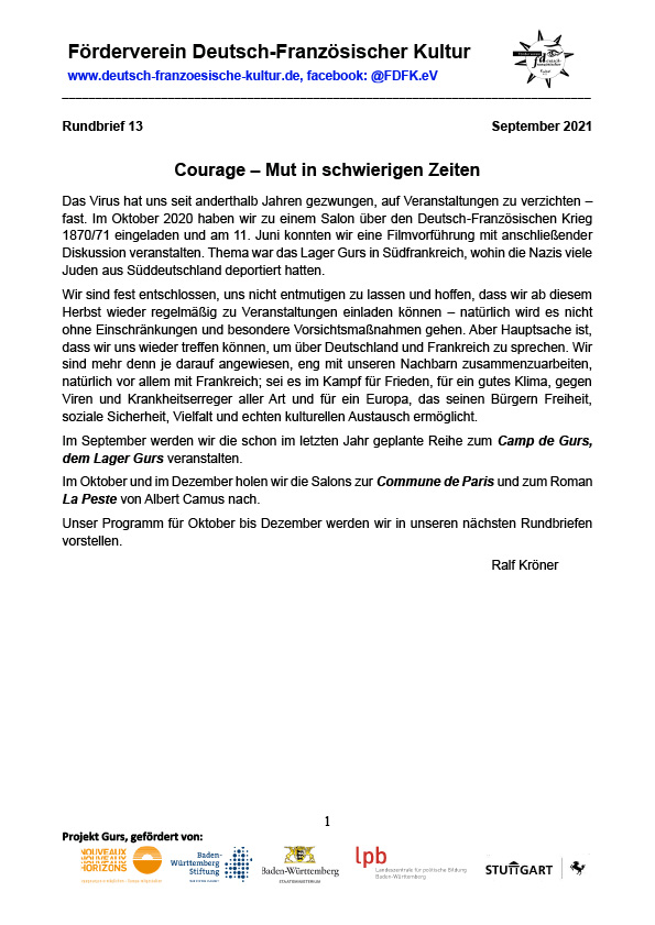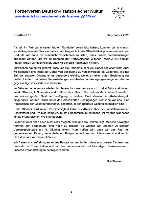 Dieser Rundbrief stellt die schwierige Situation des Vereins während der Coronapandemie dar.